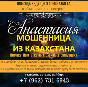 Шарлатанка Анастасия Бродская (www-gadau.ru, +7 (962) 731-69-93) — мошенница из Казахстана Наталья Стрельникова, безумная аферистка и пройдоха.