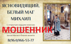 Белый маг Михаил (магия-добра.рф, 8 (964) 966-53-77) — шарлатан, мошенник цыган из Ростова-на-Дону. Обманул на 5400 рублей, которые выпросил якобы на пожертвование храму за приворот любимой девушки за 1 ночь и для закупки вина и мяса для проведения специального ночного обряда приворота.