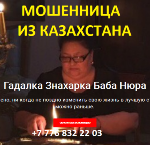 Гадалка баба Нюра (gadalka-ekstrasens.ru, +7 776 832 22 03) — шарлатанка, омерзительная мошенница из Казахстана Стрельникова Наталья Геннадьевна.