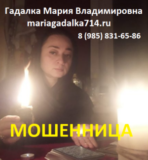 Гадалка Мария Владимировна (mariagadalka714.ru, 8 (985) 831-65-86) — шарлатанка и мошенница не имеющая никаких магических способностей, насквозь лживая и трусливая аферистка с больной психикой. Обманула меня на 3300 рублей выманив их из меня под предлогом закупки материалов для приворота, после чего внесла мой телефон в черный список.