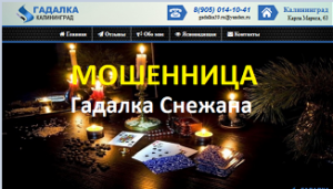 Гадалка Снежана (gadalka39.ru, 8 (905) 014-10-41, whatsapp 8 (996) 004-88-28, [email protected]) — шарлатанка, мошенница из Калининграда, отвратительная лживая балаболка, которая развела меня на 16000 рублей, которые поимела с меня за снятие выдуманной ей порчи и обещала, что после этого ко мне вернется мой муж, но никто никуда не вернулся.