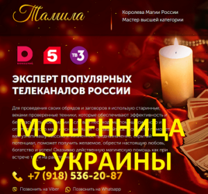 Королева магии Тамила (magiyahelp.site, +7 (918) 536-20-87) — шарлатанка, сумасшедшая мошенница с Украины, которая рассылает спам на электронные почты людей и навязывает ее шарлатанские привороты вместе с ее каким-то духовным наставником Виталием Цепухом, про которого везде в интернете пишут, что он уголовник-рецидивист и психически больной мракобес, шантажист и вымогатель денег.