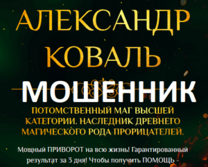 Маг Александр Коваль (alexander-koval-help.ru, +7 (911) 008-40-94) — шарлатан, малолетний сексуально озабоченный мошенник извращенец с искалеченной психикой из Санкт-Петербурга, который сначала вел себя нормально и обещал мне результат его приворота за 3 дня с гарантией и бесплатно, а на самом деле обманул на 8500 рублей, выманив их из меня под предлогом закупки какой-то чепухи якобы для проведения обряда.