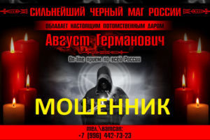 Маг Август Германович (koldun.predskazivau.site, +7 (996) 442-73-23) — шарлатан и мошенник из Казахстана, подонок которому я по глупости доверилась и была обманута этим казахом проходимцем на 8900 рублей, которые перечислила этому подлецу якобы на закупку старого жертвенного ишака.