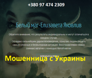 Маг Елизавета Яковливна (elizaveta-mag.com, +380 97 474 2309) — шарлатанка, мошенница с Украины, бессовестная лживая тварь и гадина, которая занимается обманом людей в интернете, стоя из себя магиню и ясновидящую и скрывает свое местонахождение у нас в Украине.