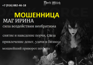 Маг Ирина (darkwitch.ru, +7 (916) 882-46-18) — шарлатанка, мошенница, ненормальная малолетняя девица, шантажистка и вымогательница денег.