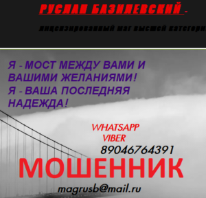 Шарлатан маг Руслан Базилевский (magika1.com, 89046764391, [email protected]) — мошенник и скот, мразь и ублюдок. Обманул меня на 6500 р. со своими шарлатанскими приворотами. Как только получил от меня деньги, то сразу испарился и внес мой телефон в черный список.