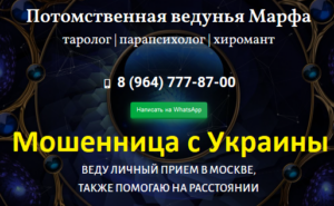 Потомственная ведунья Марфа (маг-ясновидящая.рф, +7 (964) 777-87-00) — шарлатанка, мошенница и негодяйка с Украины. Обещала результат приворота за 1 сутки, за что я заплатила этой твари 77000 рублей на банковскую карту какой-то мошенницы Юлии Вячеславовны Ледашевой-Табан (Y.LEDASHCHEVA-TABAN), номер карты Сбербанка 5484 5200 1891, про которую потом прочла в интернете, что это подставная карта этой украинской твари мошенницы и шарлатанки потомственной ведуньи Марфы (маг-ясновидящая.рф).