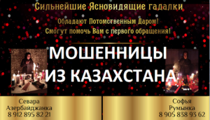 Сестры гадалки Юнусовы Севара и Софья (predskazatelnica-gadalka.ru, 8 (912) 895-82-21 и 8 (905) 838-93-62) — шарлатанки и мошенницы из Казахстана, под кличками которых срывается мерзкая казашка мошенница Стрельникова Наталья Геннадьевна и какая-то ее подруга уголовница напарница, которая ужасно матерится по телефону и угрожает наведением смертной порчи, если прекратить платить ей деньги за ее шарлатанство.