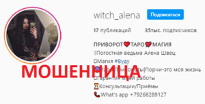 Ведьма Алена Швец (instagram.com/witch_alena, +7 (926) 828-91-27‬) — шарлатанка из Инстаграм, мошенница и жуткая мразь, которая называет себя «погостной ведьмой», а на самом деле является малолетней тварью, которая разводит и обманывает людей на деньги под чужим фото на ее аккаунте в Инстаграм.