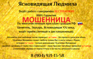 Ведунья Людмила (ведунья-людмила.рф, 8 (904) 921-13-58) — шарлатанка, мерзкая и очень грубая цыганка мошенница из Ростова-на-Дону, которая прикидывается почти святой, называет себя сильнейшим магом 21 века и обещает всем результат приворота за 1 день.