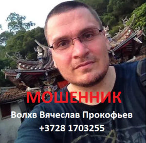 Волхв Вячеслав Прокофьев (prokofievv.com, +3728 1703255, [email protected]) — шарлатан и мошенник из Эстонии, крайне подлый проходимец и аферист. Обманул на 370 долларов и все время пытался еще выманить деньги на якобы усиление его шарлатанского приворота, хотя с самого начала клялся, что никаких дополнительных оплат не потребуется и говорил, что он якобы во всей Прибалтике самый сильный маг и что якобы к нему даже известные публичные люди обращаются.