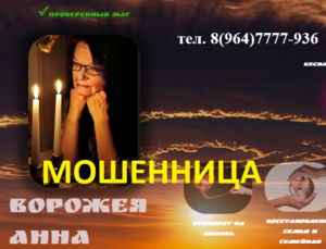 Ворожея Анна (m-onlife.ru, 8(964)7777-936) — шарлатанка и мошенница, грязная воровка и кидальщица на деньги. Обманула на 4700 р. во время болтовни с этой сволочью по телефону, выманив с меня эти деньги якобы на приобретение каких-то свечей и масла для приворота.