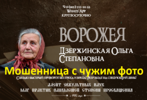 Ворожея Дзержинская Ольга Степановна (olga-stepanovna.ru, 8 (905) 555-10-22) — шарлатанка и мошенница с чужим фото старушки, мерзкая и очень подлая гадина. Обманула на 4500 рублей и после того как никакого обещанного результата за 3 дня от ее приворота не произошло, начала вымогать уже 13000 рублей и врать про всякие порчи на всех.