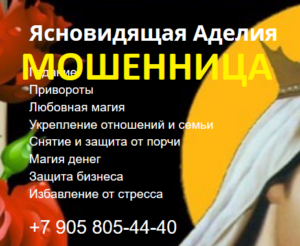 Ясновидящая Аделия (adelia-magia.ru, +7 (905) 805-44-40, [email protected]) — шарлатанка, очень наглая, грубая мошенница из Ростова-на-Дону, которая врет на ее сайте и в рекламе, что якобы принимает людей в Москве.