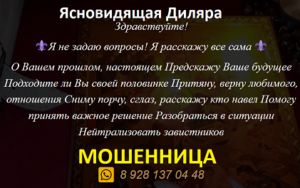 Ясновидящая Диляра (ясновидящая-диляра.рф, 8 928 137 04 48) — шарлатанка и мошенница, подлая и бессовестная аферистка. Обманула меня на 4600 рублей, за которые поклялась ее здоровьем приворожить мне ушедшего парня за 6 дней, но как только это время прошло и ничего не изменилось, эта шарлатанка ясновидящая Диляра стала настойчиво выпрашивать у меня еще 12000 рублей и врать, что обнаружила на моем парне порчу на смерть, которую нужно срочно снимать.