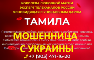 Ясновидящая Тамила (tamilamag.site, +7 (903) 471-16-20, [email protected]) — шарлатанка и мошенница из Украины, которая врет, что якобы находится в центре Москвы и очень жестоко обманывает людей.