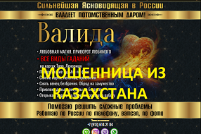 Ясновидящая Валида (gadaniya-mag.ru, +7 (913) 614-21-84) — шарлатанка, мразь мошенница из Казахстана Стрельникова Наталья Геннадьевна. Обманула на 4300 рублей, затребовав их якобы на закупку молодого барана, которого она собиралась принести в жертву для какого-то ее приворота на крови с результатом за 1 ночь, но после перевода денег этой гадине, она сразу же пропала и больше до ней не дозвониться.