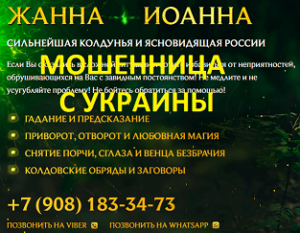 Шарлатанка Жанна Иоанна (zhanna-ioanna.site, +7 (908) 183-34-73, mail: [email protected]) — мошенница с Украины, которая прикидывается ясновидящей из Москвы. Подлая тварь, которая обманывает людей в составе преступной группировки украинских уголовников и мошенников.